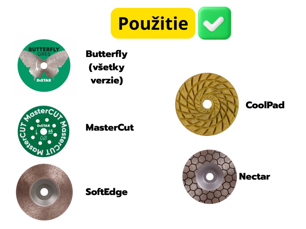 Je určená pre rezné kotúče Distar s montážnymi otvormi 5,8 mm a 9,6 mm, ako aj pre brúsne kotúče Nectar a Soft Edge s otvorom 5,8 mm. Taktiež obsahuje aj základňu so suchým zipsom pre brúsne a leštiace pady CoolPad 50 mm.