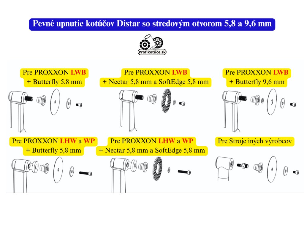 Je určená pre rezné kotúče Distar s montážnymi otvormi 5,8 mm a 9,6 mm, ako aj pre brúsne kotúče Nectar a Soft Edge s otvorom 5,8 mm.
