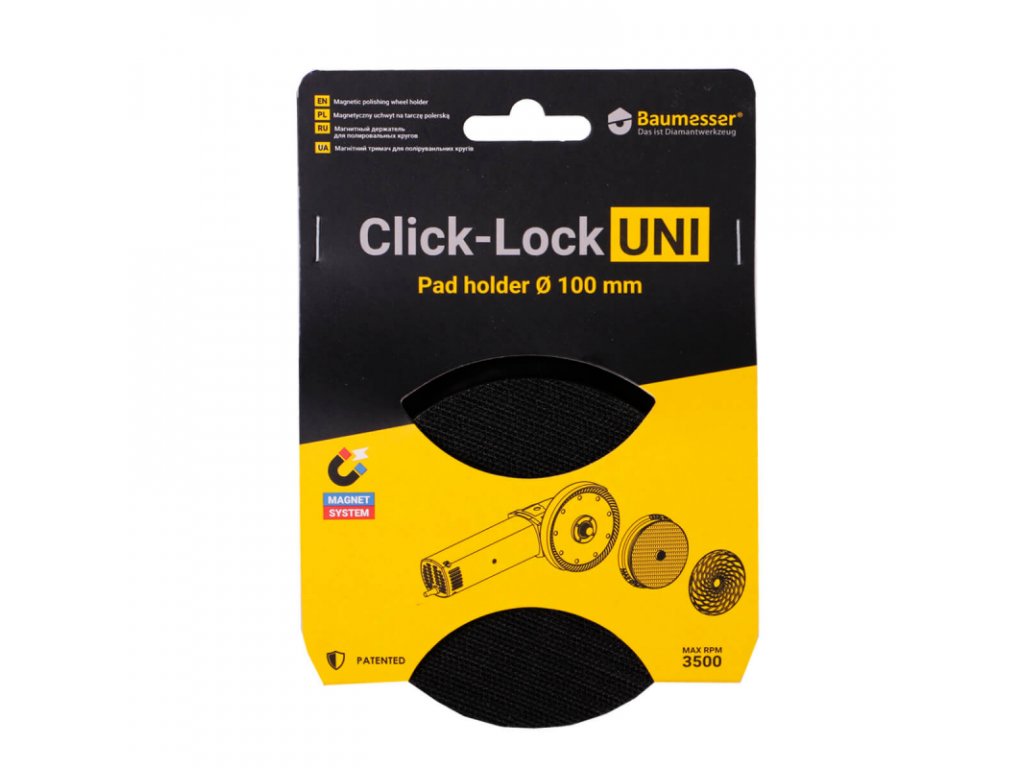 Držiak Click-Lock Uni je vyrobený z plastu, takže je ľahký a spoľahlivý. Má ergonomický povrch pre jednoduchú výmenu brúsneho a leštiaceho ktúča. Držiak sa dá upevniť na väčšinu uhlových brúsok, treba dbať na to, aby upínacia matica vašej brúsky vyčnievala nad kotúč aspoň 12 mm. Použite štandardnú upínaciu maticu. Brúsny a leštiaci kotúč sa prichytáva na držiak Click-Lock Uni pomocou suchého zipsu, držiak Click-Lock Uni sa prichytáva na rezný kotúč, ktorý je prichytený na uhlovej brúske pomocou magnetou.