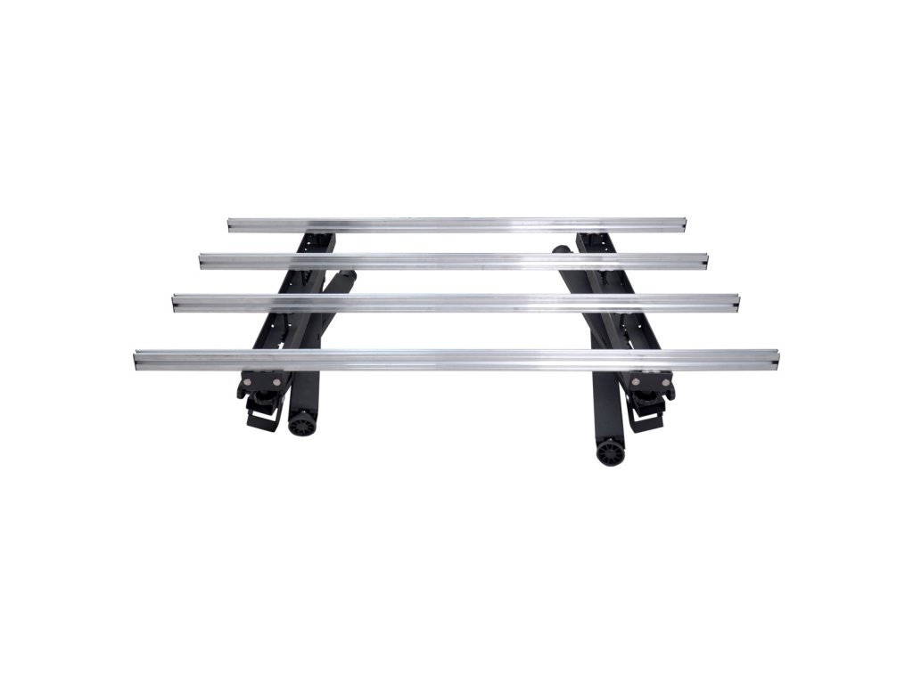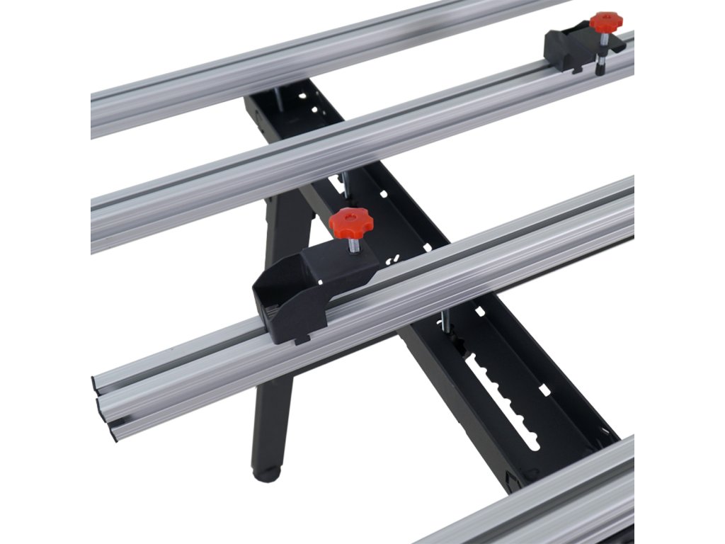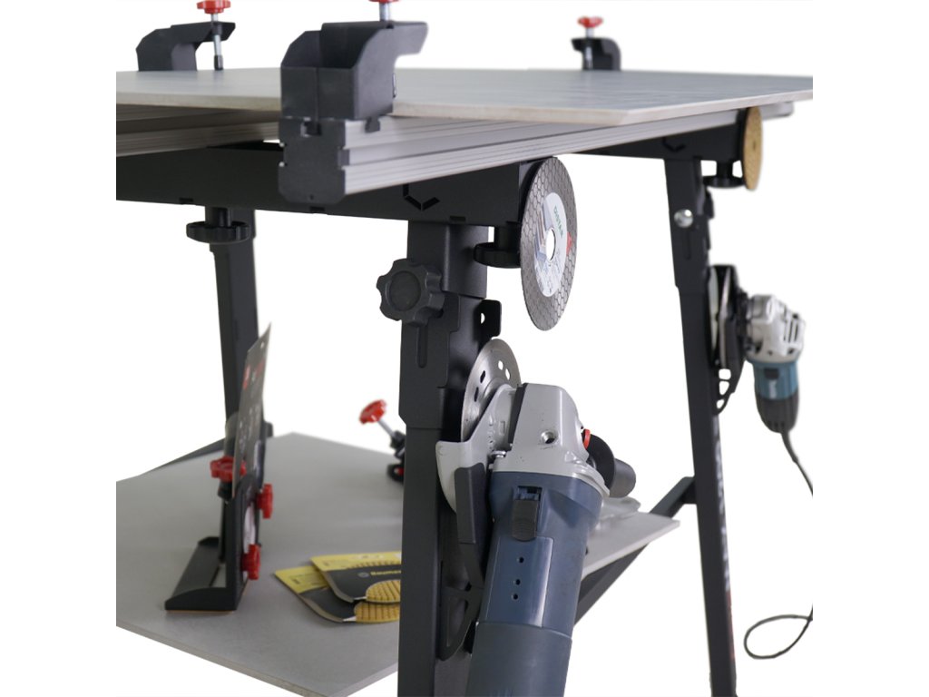 - Pozdĺžne tyče na nohách stola umožňujú položiť akýkoľvek doskový materiál (dlaždice, sadrokartón, preglejku atď.) a vytvárajú pohodlnú policu na uloženie náradia.
